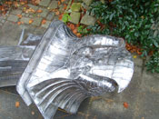 | v.o.n.u.: New York Below, einer der Adlerköpfe des Chrysler Buildings fungiert als Untergangsszenario, indem er aus Schutt heraus ragt. Siehe auch großes Bild links; 2 Bilder: Auftragsarbeit für Fa. Ekom Air Ahrensburg, Kompressor-Skulptur zum 25-jährigen Jubiläum, während der Produktion und im Foyer des Hauptsitzes in Tschechien. |